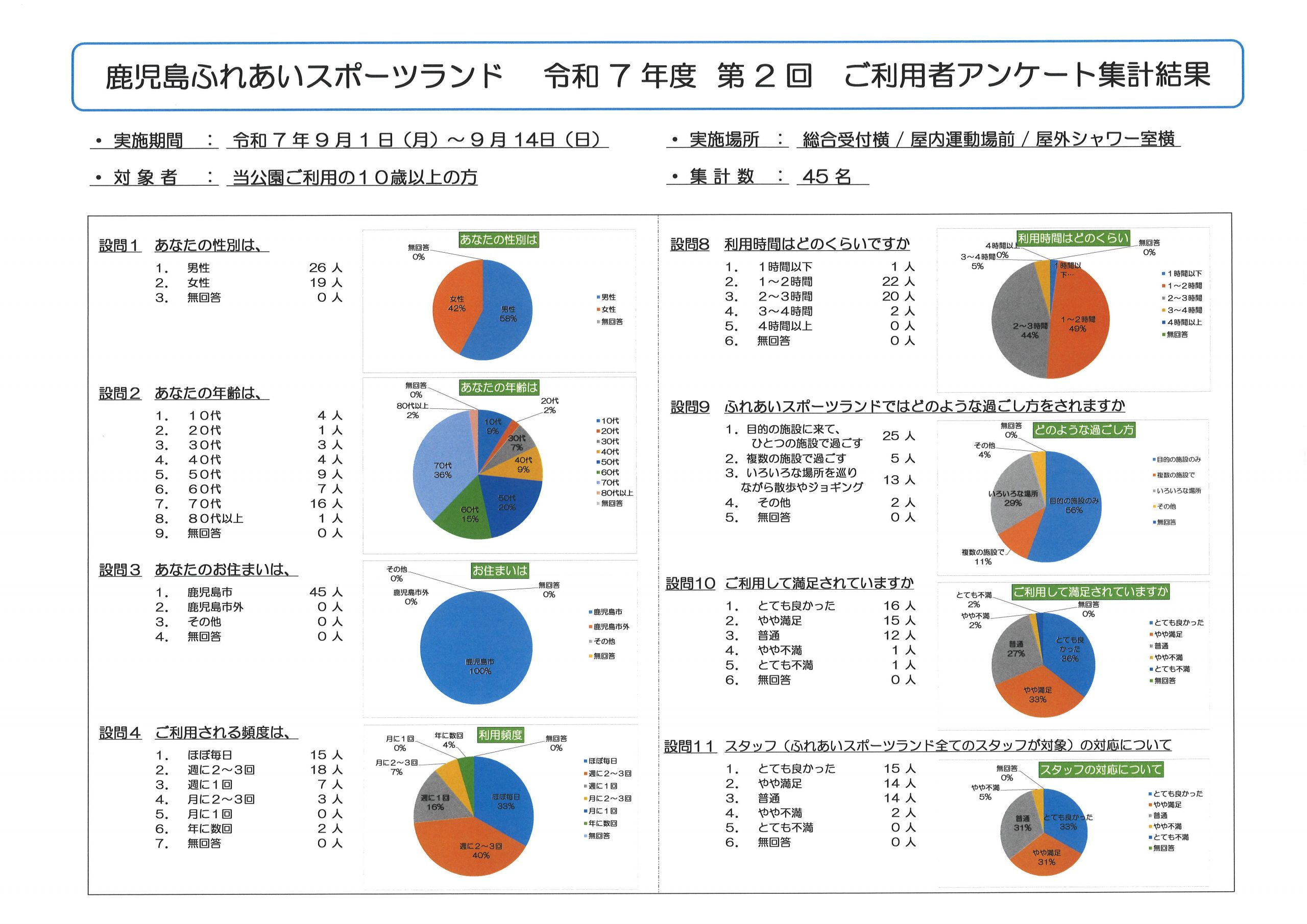 鹿児島ふれあいスポーツランドでは、今後の管理運営に利用者の方々のご意見やご要望などをお聞きして業務の改善等に活かし、尚一層お客様に喜んで頂けるような、鹿児島ふれあいスポーツランドにするために、年 4 回アンケートを実施しています。令和 7 年度 第 2 回 ご利用者アンケートの集計ができましたので、ご報告いたします。