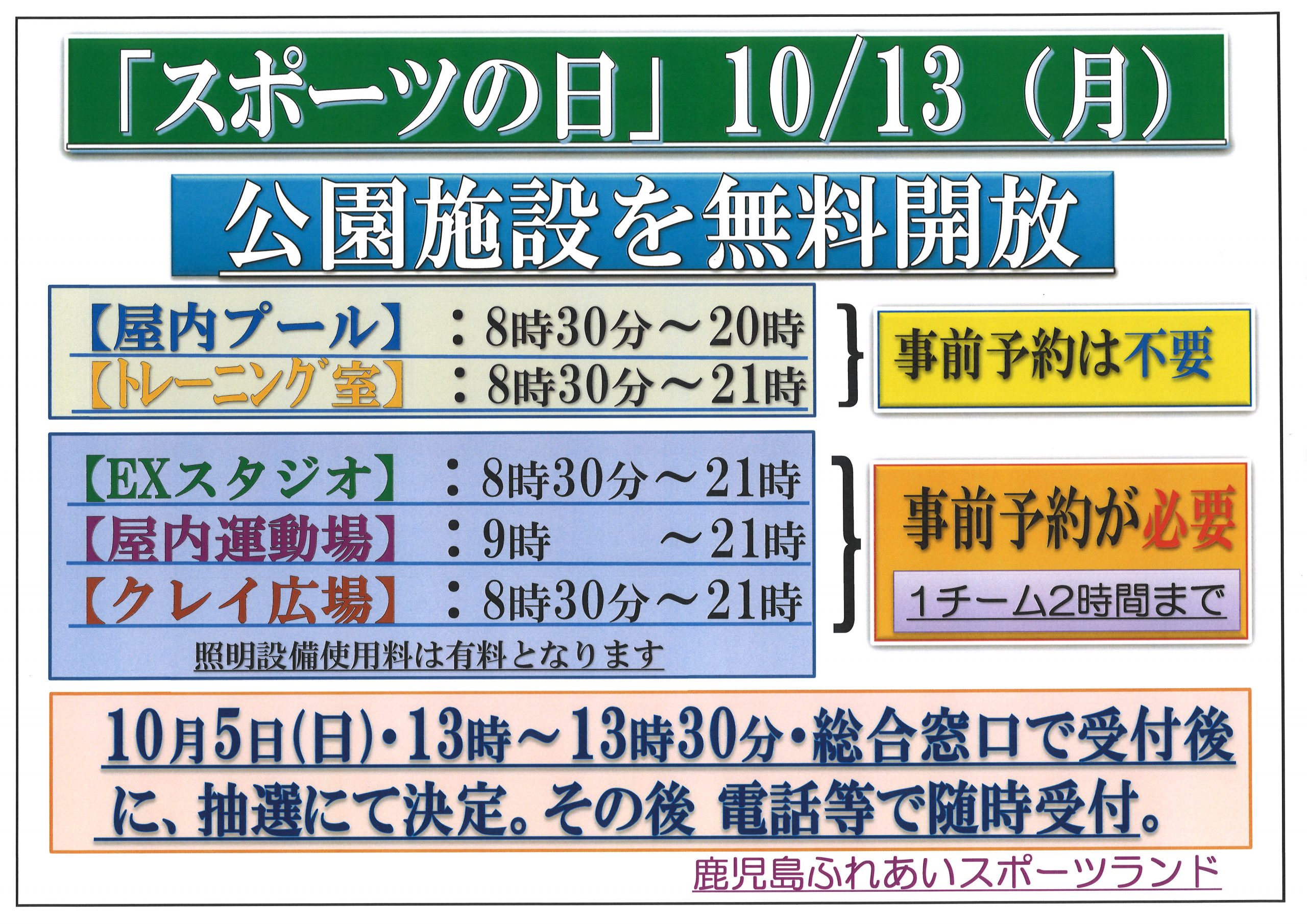 >「スポーツの日」10月13日(月)有料施設無料開放のご案内!