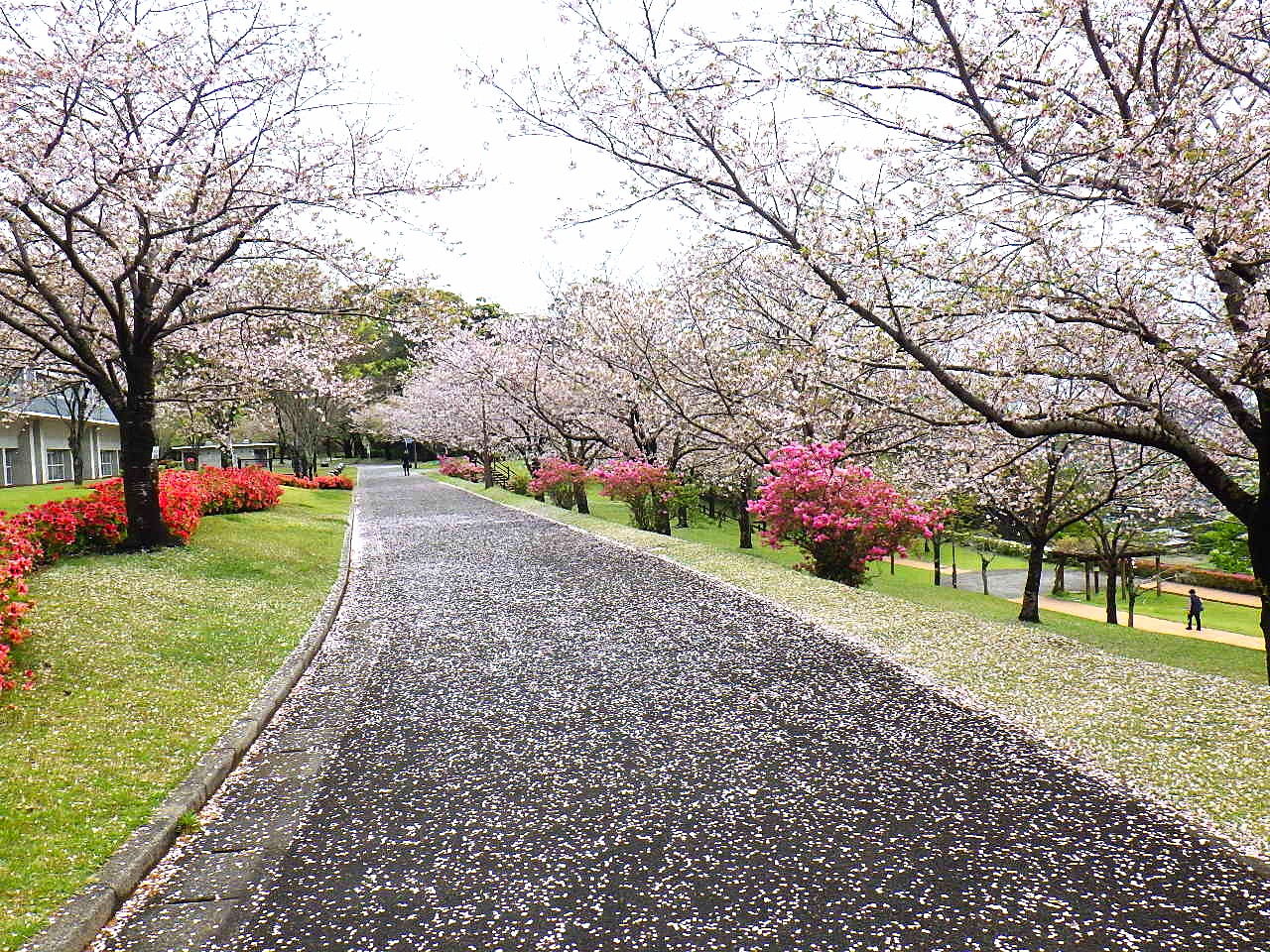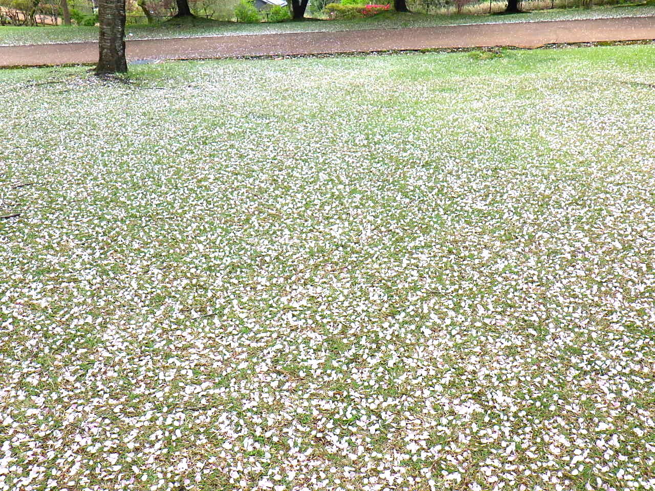 写真【花の広場】プール棟、園路沿いの【ソメイヨシノ】は、例年は散り始めが4~5日遅いのですが、今年は同じように散り始めています。