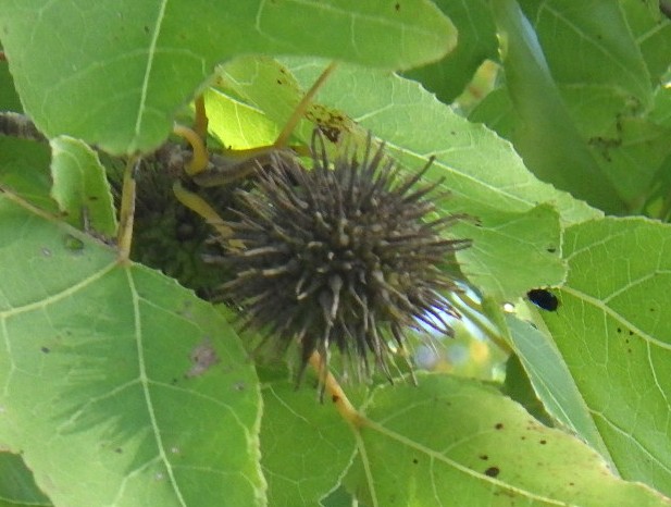 「アメリカフウ」も「タイワンフウ」も、マンサク科の落葉高木です。街路樹や公園樹としてよく植えられています。秋にはウニのようなトゲトゲした球形の果実を付けます。